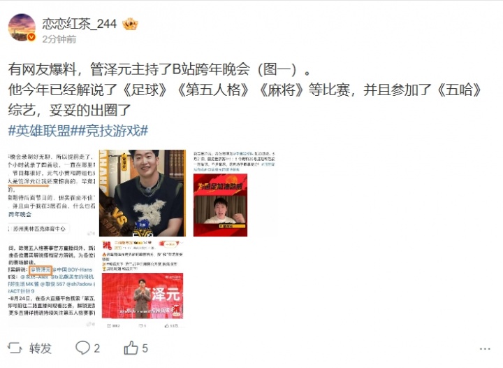 >妥妥的出圈了?网友爆料:今年B站跨年晚会主持人为LPL解说管泽元