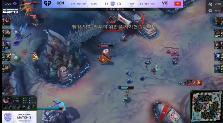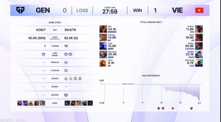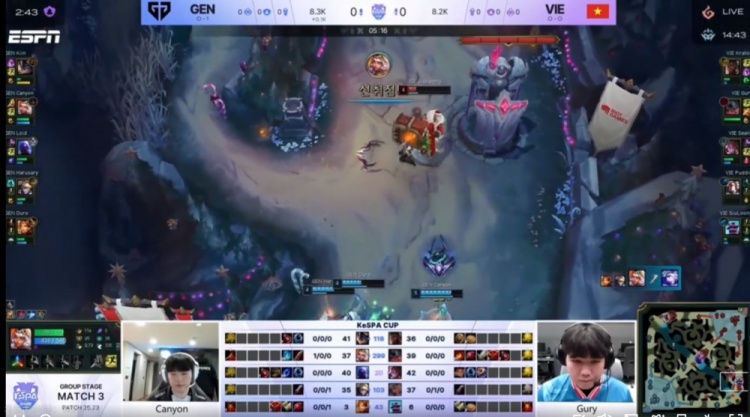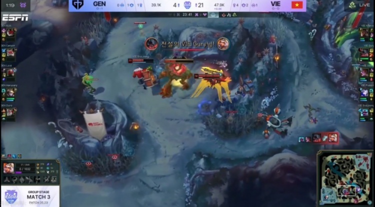 本局比赛Gury打野剑魔打团出效果,巢虫团大灭双杀之后VIE拿下优势稳步推进,Seany阿萝拉团战大招也让GEN苦不堪言!GEN这边只有Kiin兰博有点输出,但是团战碰VIE一碰就碎啊!面对被扩大的经济差和装备GEN毫无伤害,VIE一路平推,拿下炼金龙魂+大龙之后高地团轻松击杀GEN四人结束比赛!GEN遭遇小组赛两连败!
