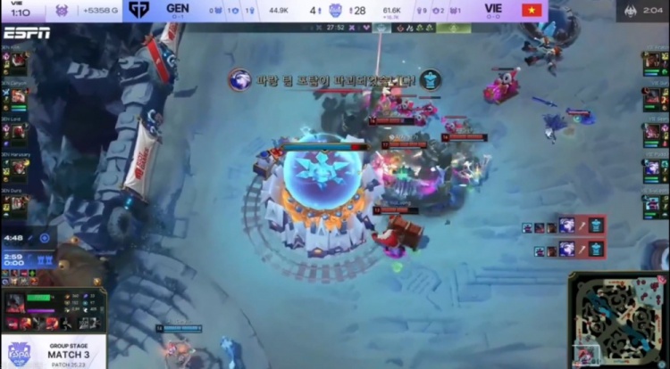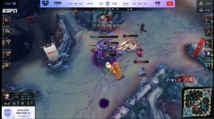 【11:32】Canyon绕后gank配合Kiin兰博击杀Kratos奎桑提,但是下路组对线GEN双人都被打残,VIE拿下小龙之后Seany阿萝拉罩大留人,VIE追到了下二塔,最终再打出一波1换3!