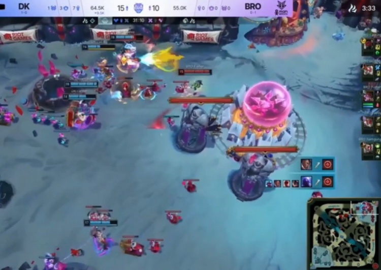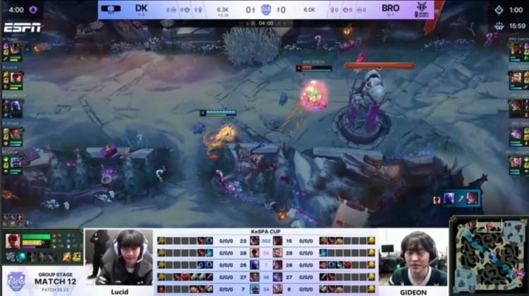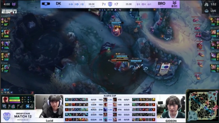 中期GIDEON奇亚娜带动上下两路节奏,BRO扳回前期劣势经济实现反超。后期Lucid盲僧进场开踢,许哥瑞兹在小龙与大龙争夺中不断拿到击杀,DK拿下大龙后融化BRO,一波推平BRO基地拿到比赛胜利。
