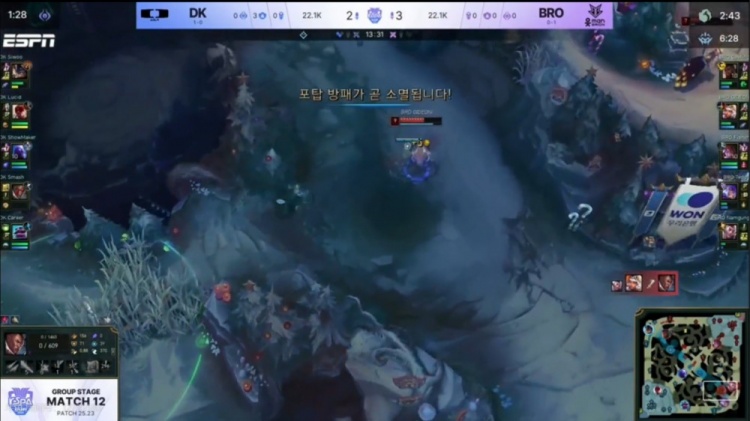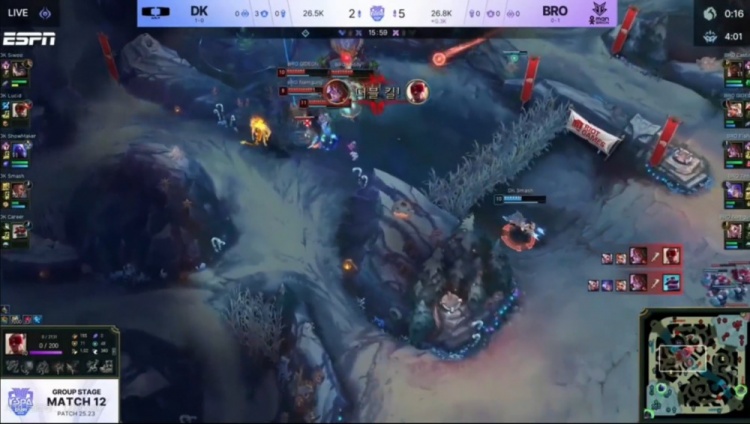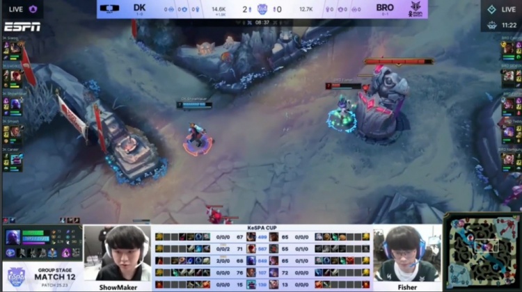 【22:16】上路混战,DK野辅瞬间睡着,Fisher阿萝拉开大配合GIDEON奇亚娜开大双杀,BRO回头拿到小龙,经济落后1k。