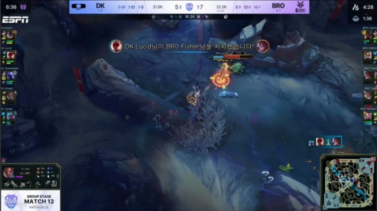 【29:21】小龙团,Lucid盲僧野区踹飞Fisher阿萝拉,许哥瑞兹绕后控住Casting奎桑提将其赶走,随后许哥中路带走Namgung洛,DK拿到大龙,许哥带队一波推平BRO基地拿到比赛胜利。