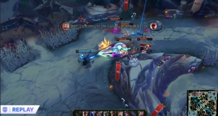 【12:52】野区混战,Lucid盲僧R闪踢到Namgung洛,GIDEON奇亚娜推到Lucid后将其击杀,紧接着Smash卢锡安下路河道又被GIDEON逮捕,BRO打出0换2。