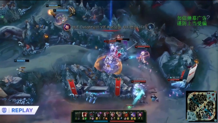 本场比赛前期Delight妮蔻单杀SiuLoong妖姬,随后HLE四人下路轻松越掉VIA双人组,中路小吕布芸阿娜单杀Puddin卡莎后被换,HLE逐步拿到经济优势。