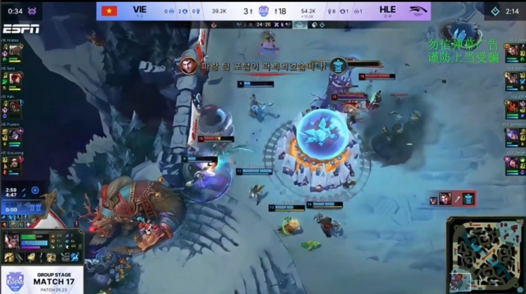 【23:55】HLE下路推进再杀Kati丽桑卓,HLE轻松一波推平VIE基地拿到比赛胜利。
