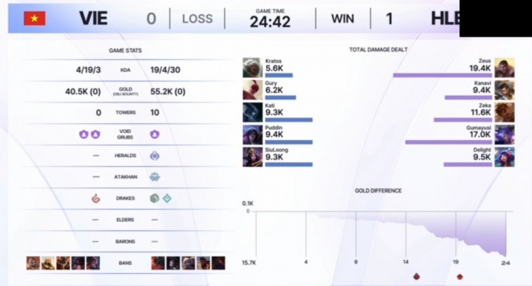 中期Gury盲僧两度来下与队友越塔失败返送人头,SiuLoong妖姬做视野多次被逮捕,HLE借机拿到厄塔汗后摧枯拉朽将经济优势扩大至一万以上。后期VIA毫无一战之力,HLE无需大龙轻松推平VIE基地拿到比赛胜利。
