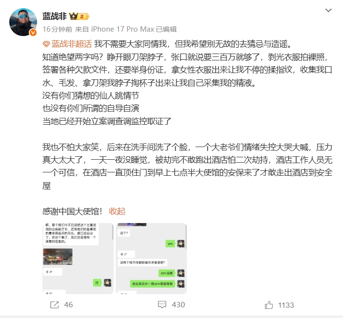 蓝战非:“我不需要大家同情我,但我希望别无故的去猜忌与造谣。知道绝望两字吗?睁开眼刀架脖子,张口就说要三百万就够了,剥光衣服拍裸照,签署各种欠款文件,还要举身份证,拿女性衣服出来让我不停的揉指纹,收集我口水、毛发、拿刀架我脖子掏杯子出来让我自己采集我的精液。