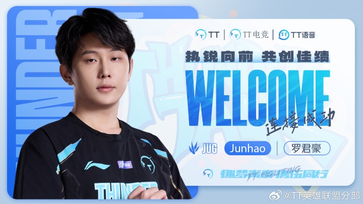 经双方友好协商,我们很高兴地宣布:即日起,选手罗君豪(ID: Junhao)正式加入TT英雄联盟分部,担任打野位置。