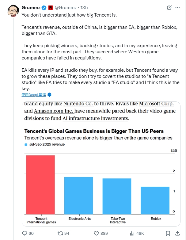 直播吧12月11日讯 前《魔兽世界》制作人 Mark Kern(昵称 Grummz)近日在社交平台 X 上分享了对腾讯的观察。他指出:“很多人并不真正了解腾讯的规模。仅在中国市场以外,腾讯的收入就已超过艺电(EA)、Roblox 甚至《GTA》系列的表现。”