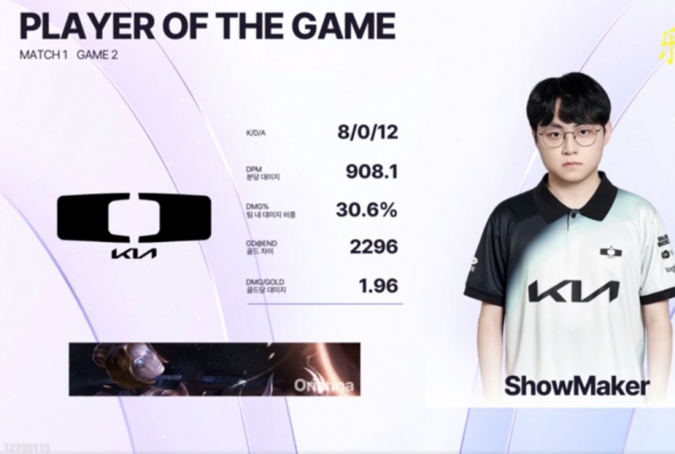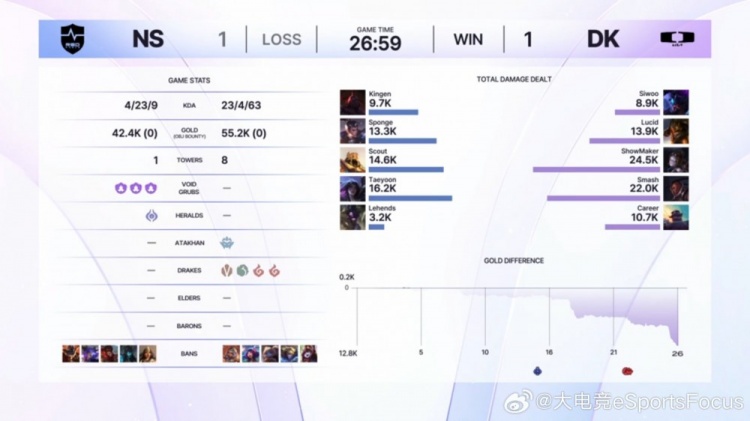 第二局NS换线结果直接给Taeyoon卡莎换崩!DK则是依靠下路优势拿到小龙主动权!中期ShowMaker发条开始发力,对位单杀Scout沙皇之后团战连续给出好大,NS这边则是上野中辅轮着开送,Taeyoon卡莎受限于装备和输出环境毫无办法!厄塔汗团Smash卢锡安四杀奠定胜局!最终DK也是暴打一局NS,将比分扳平到了1-1!