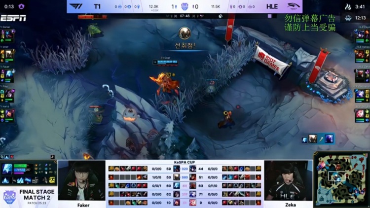 【7:46】zeka瑞兹补给回线,没闪的瑞兹压Faker凤凰站位靠前,Oner潘森自家F6跳大落地控住Zeka,轻松帮助Faker拿到一血。