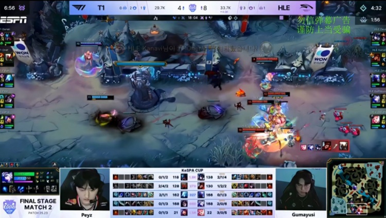 【32:29】龙魂团,kanavi猴子又先送人头,Peyz五杀融化HLE,T1杀死比赛融化HLE扳回一城。
