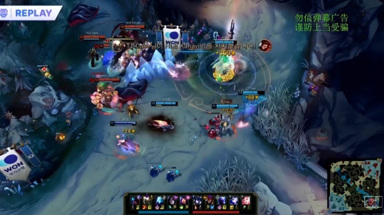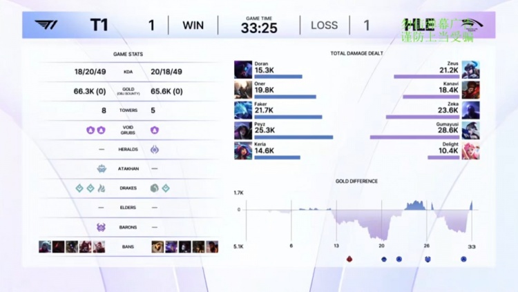 中期HLE下路推进融化Oner潘森,厄塔汗团战Kanavi猴子送关键人头,Oner潘森抢下厄塔汗后T1打出0换3。后期Kanavi猴子在龙魂团又送出关键人头,Peyz卡莎爆轰五杀融化HLE后杀死比赛,一波推平HLE基地扳回一城。