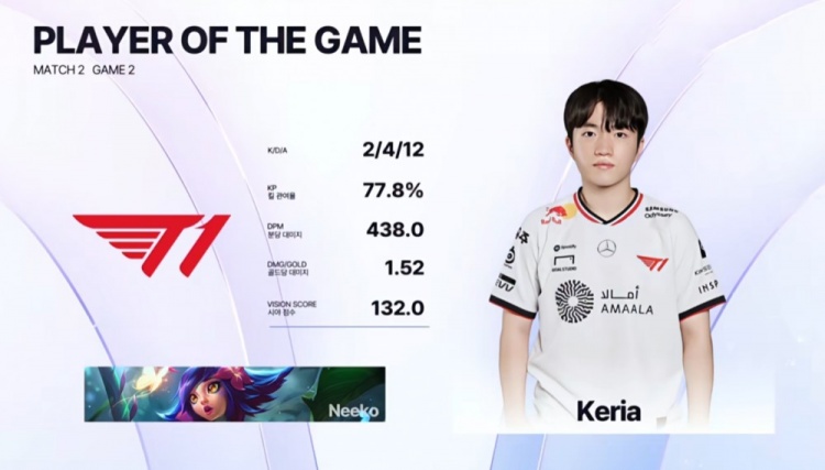 第二局前期Oner潘森跳大协助Faker拿到zeka没闪的瑞兹一血。双方在先锋处交换人头后,T1下路推进失误,Peyz卡莎与Keria妮蔻连续被delight萨勒芬妮与Gumayusi艾希击杀,HLE反超经济。