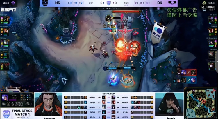 【11:12】上路Siwoo贾克斯一打二拖时间,Career璐璐赶到给贾克斯大招,两人合力打出0换2!下路NS三人绕后强杀Smash芸阿娜,但是回头SMK阿狸支援赶到,Kingen船长再死一次!DK顺势拿下二小龙!5K经济差了!