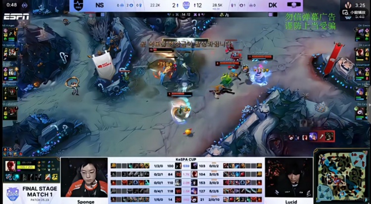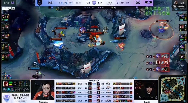 【8:25】NS拿下两虫,ShowMaker阿狸绕后RE命中配合队友秒掉了Sponge琪亚娜!随后拉二段宝珠配合队友再留NS下路组!这波DK打出0换3!3K经济差了!