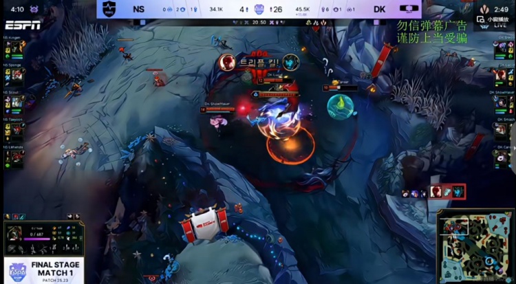 【9:45】下路Kingen船长喜欢省闪,结果被DK下路组直接配合强杀!