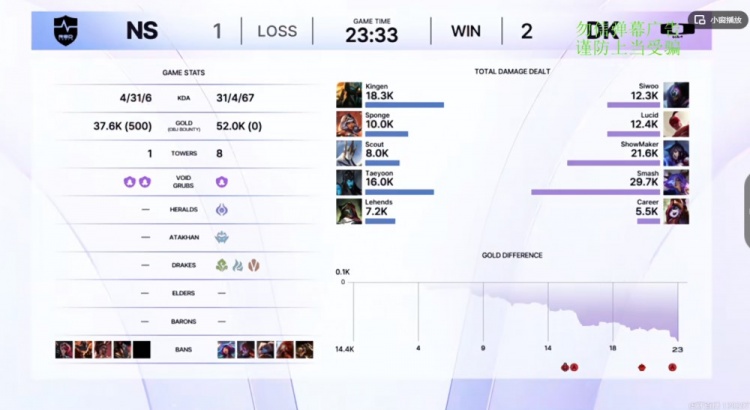 第三局DK一选盲僧,Lucid也不负众望前期连续带起节奏!ShowMaker阿狸则是对线给到Scout加里奥巨大压力,直接对位压了40刀!中期团战Lucid盲僧连续收割越打越肥,野区配合双C团战简直不要太好打啊!甚至还有一打四不死的战神局面!NS面对被拉开的经济差毫无办法,最终DK仅仅23分钟,以31-4的击杀比结束比赛,让一追二击败NS晋级胜者组!