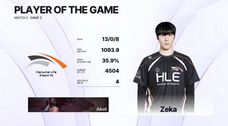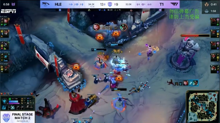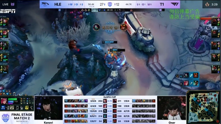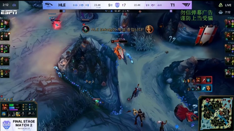 【23:02】zeka阿卡丽第三次单杀Faker梅尔,随后宙斯杰斯上路1v2被打残,HLE众人跟支援到位,Oner皇子卖掉自己,zeka阿卡丽单杀多兰赛恩,野区Kanavi逮捕Peyz,HLE打出0换3,经济领先9k。