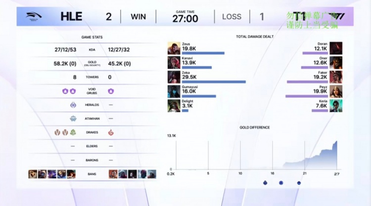 后期Peyz希维尔虽在厄塔汗处拿到三杀,但zeka阿卡丽反轰三杀还以颜色,后续zeka阿卡丽带队入侵T1野区完成四杀,HLE推平T1基地拿到比赛胜利晋级胜者组决赛对阵DK,T1掉入败者组对阵NS!