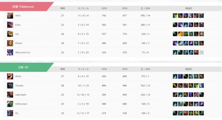 比赛进入后期,Tidebound找到机会先破VP两路,但是shiro主宰阵亡掉盾!VP趁机反拆Tidebound一路回来!下路一波团战Timado的TB没人处理,双方三号位都是买活死,但是这波VP的2换4获胜,也拆掉TBD两路高地!但是想破第三路未果又被Tidebound打回来了!决胜的肉山团shiro主宰直接被TB秒掉没买,VP一波基地拿下首局!