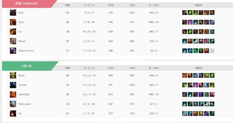 天辉VP:Fly杰奇洛、Abed獣、Hellscream琼英碧灵、Timado恐怖利刃、SaberLight斧王