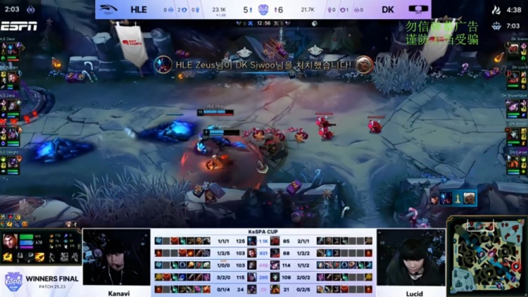 【22:35】宙斯带掉DK上路二塔,小龙团,zeka发条空大,Lucid剑魔拿到小龙,宙斯雷克塞被Siwoo安蓓萨追击急忙挖走,双方拉开,HLE吃光DK下半野区资源经济领先4k。