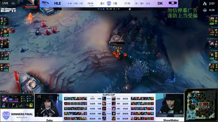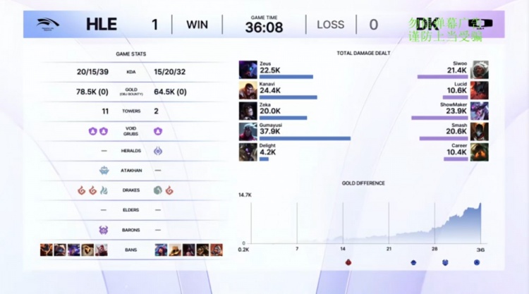 后期,宙斯上路单杀许哥辛德拉,Siwoo安蓓萨上路带线被抓,小吕布闪现向前射杀Smahs,HLE打出1换4后吃掉大龙,经济优势来到一万。最终HLE拆掉DK三路水晶,小吕布虐泉五杀收尾,HLE先下一城。