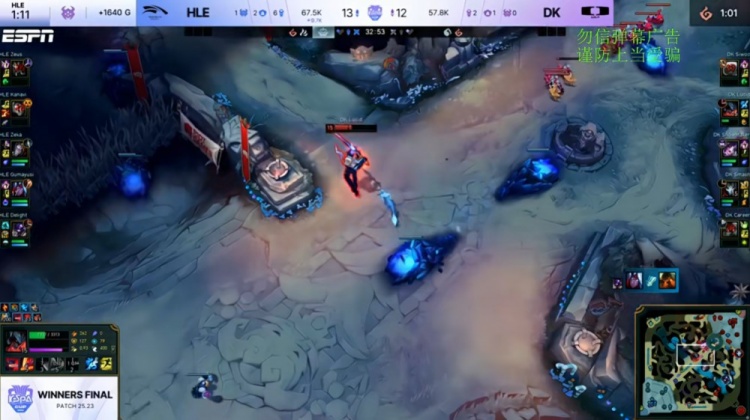 中期Lucid剑魔连续两次联手队友逮捕Gumayusi韦鲁斯,HLE随后开始运营,成功拿到厄塔汗与小龙并逐步拉开经济差距。
