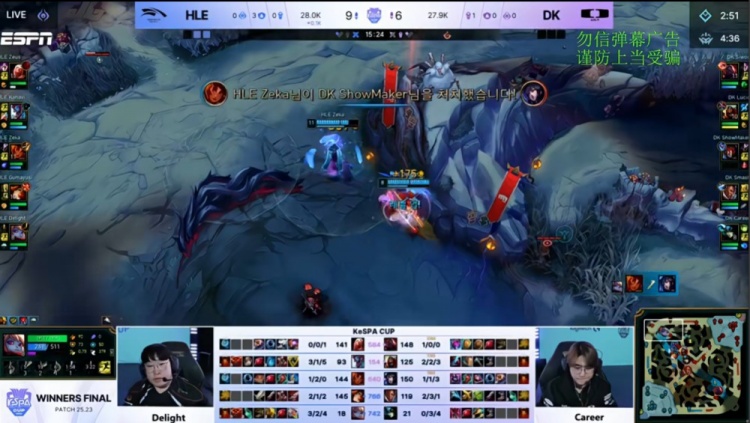 【13:51】DK四人抓下逮捕delight波比,随后DK推掉HLE下路一塔。随后许哥上路与zeka对线遭delight波比gank阵亡,HLE推掉DK上路一塔,经济领先1k。