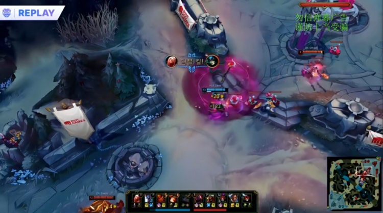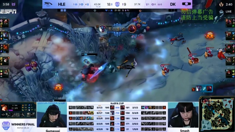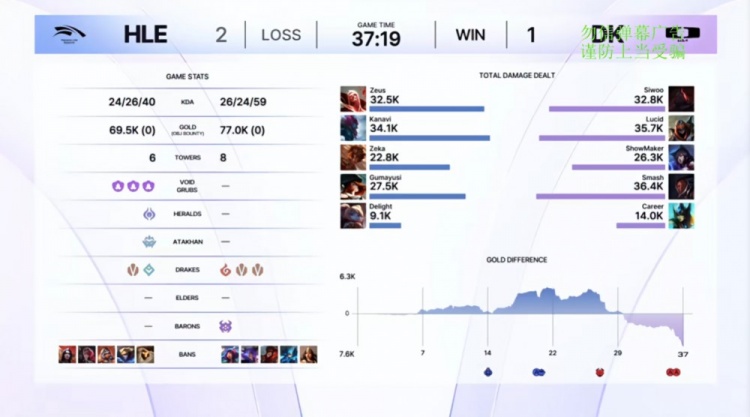 中期DK下路以多人围杀Delight波比追回局势,但HLE立即在上路利用Delight波比与Kanavi巨魔击杀许哥狐狸并推掉DK外塔。厄塔汗团战HLE打出3换5,Kanavi巨魔狂啃三杀。
