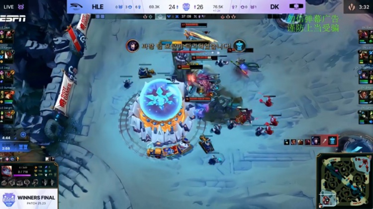 【25:42】中路混战,Kanavi巨魔继续开咬,HLE打出2换3推掉DK中路水晶,经济领先5k。