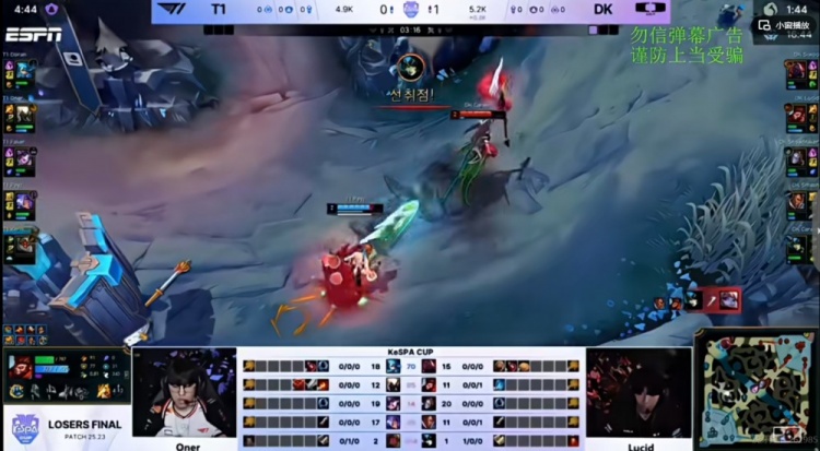 【6:45】上路Keria波比留人想配合打野gank,但是Lucid猴子直接反蹲先行将他击杀,残局Peyz芸阿娜一打三极限拉扯,开了个屏障给自己打出了机会!这波最终Peyz芸阿娜双杀,双方打了个2换2!