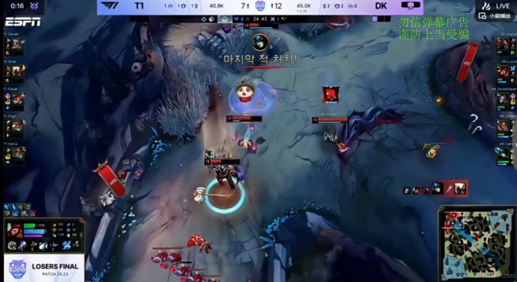 【24:15】Faker辛德拉河道单杀Career娜美之后强行拿下厄塔汗!但是Lucid猴子开转留人,侧翼Siwoo塞恩留住了Peyz芸阿娜!Doran格温还闪现撞墙了!Siwoo塞恩抗塔配合队友完成歼灭!DK团灭T1,顺势拿下大龙+小龙!直接领先快7K经济了!