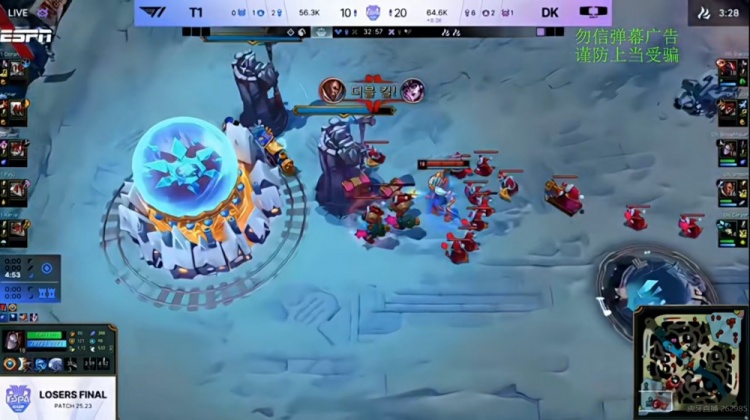 本局比赛DK新辅助Career娜美带成余震天赋,前期双方打野连续gank下路,7分钟Peyz芸阿娜上路一打三拉扯强势双杀帮助T1顶住局势!本来四核的T1中期已经稳住了,但是Faker辛德拉河道单杀Career娜美之后T1想抓住多个人的机会强打厄塔汗,结果厄塔汗拿到了但是骑脸输出的Peyz芸阿娜被逮,侧翼Doran格温闪现撞墙也没活下来!这波DK反手团灭T1,拿下大龙+小龙直接拉开7K经济差!
