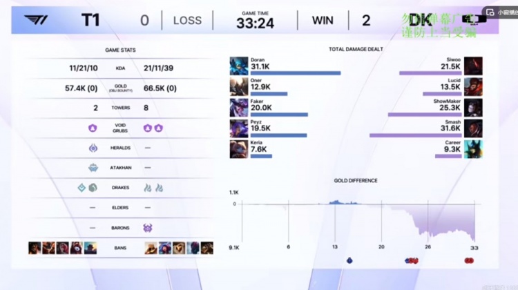 【27:00】下路Keria波比想挡伤害直接被火炮Smash卢锡安两发带走!中路Doran格温强行越塔单杀Siwoo塞恩,拿下一千块,但是自己抗塔也被换掉!DK拆掉T1下路高地!全队对位都是经济领先!
