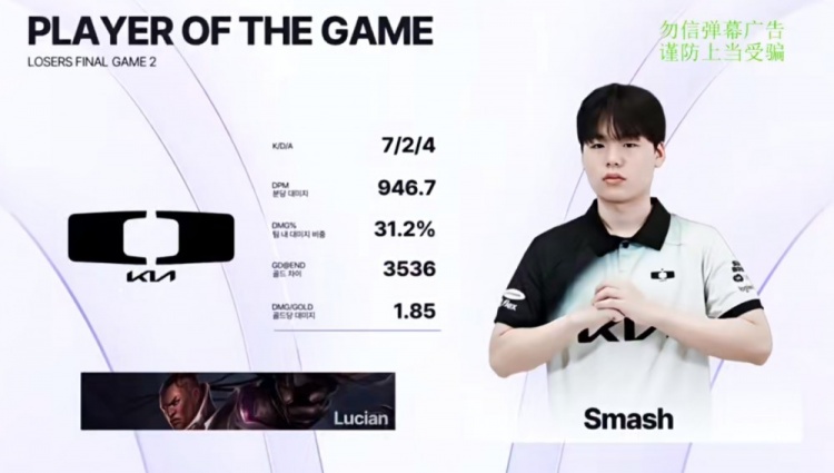 随后的比赛Smash卢锡安+SMK发条伤害T1根本扛不住,最终中路团Doran格温TP落地吃满控制白给,4打5的T1根本秒不掉这个冲后排的Siwoo塞恩,DK再次团灭T1,赢下第二局之后拿到三个赛点啊!