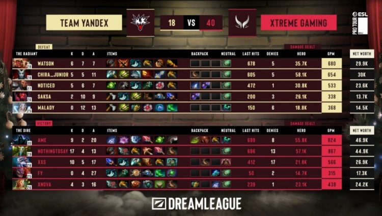 后续XG四人开雾抓Malady冰女与Notiecd斧王得手,正面NTS融化waston,XG打出1换4再吃四代肉山,junior女亡买活死,NTS带盾上高一波推平Yandex基地拿到比赛胜利。