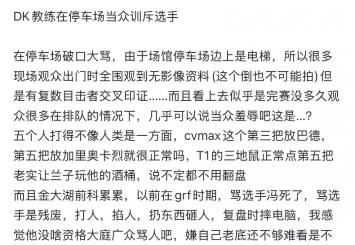 >网友发帖:在惨遭让二追三后 教练cvmax疑似停车场当众训斥DK队员
