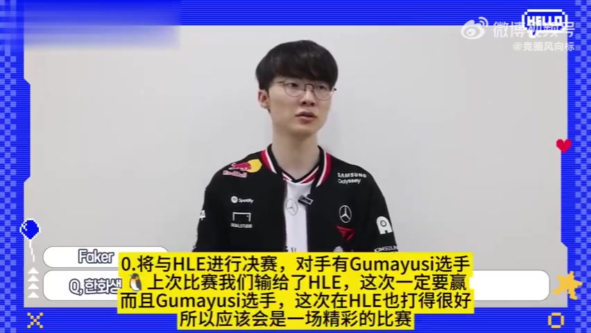 Faker::上次决赛我们输给了HLE,这一次一定要赢,而且Gumayusi选手在HLE也打得很好,所以会是一场精彩的比赛!