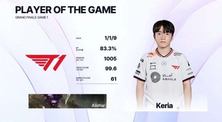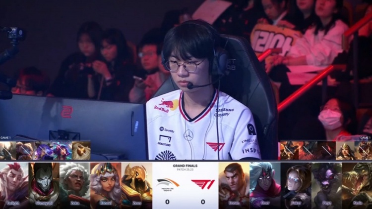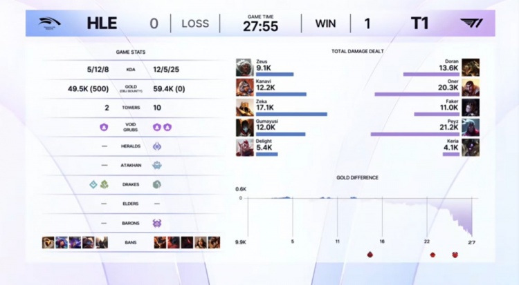 第一局前期Keria牛头闪现顶回小吕布配合Peyz韦鲁斯击杀Gumayusi烬拿到一血,巢虫团Faker发条被Delight洛带走,Keria牛头再去上路绕后配合队友逮捕小吕布,双方经济差距不大。