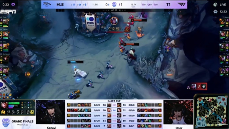 【11:41】Keria牛头上路绕后配合Oner杰斯与Peyz韦鲁斯三人包夹将小吕布击杀,但紧接着Keria牛头河道被Kanavi奇亚娜逮捕,双方打出1换1。