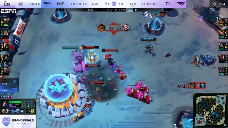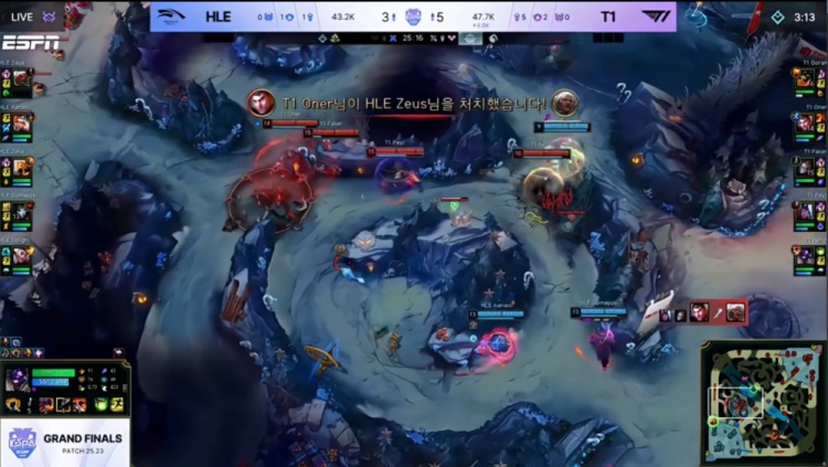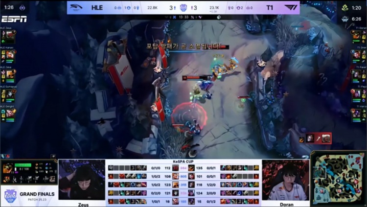 【13:27】Faker复活后TP上路落地配合多兰鳄鱼越塔强杀宙斯安蓓萨得手,Oner与Peyz同时下路推掉HLE一塔,双方经济差距依然不大。