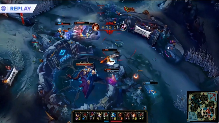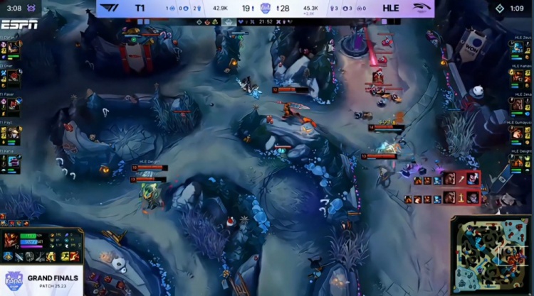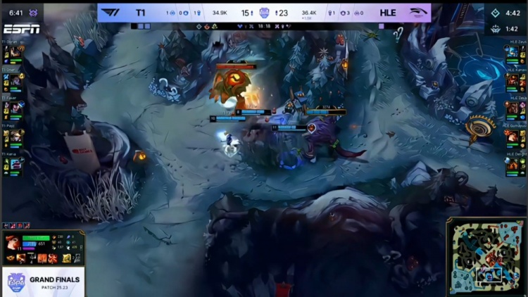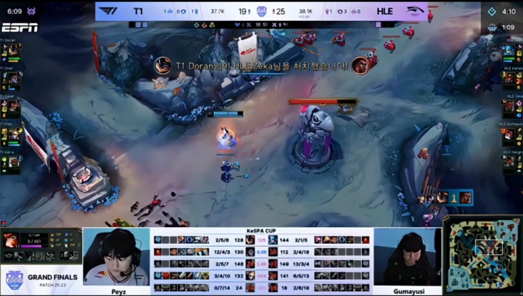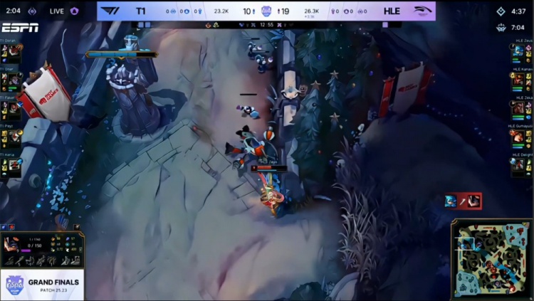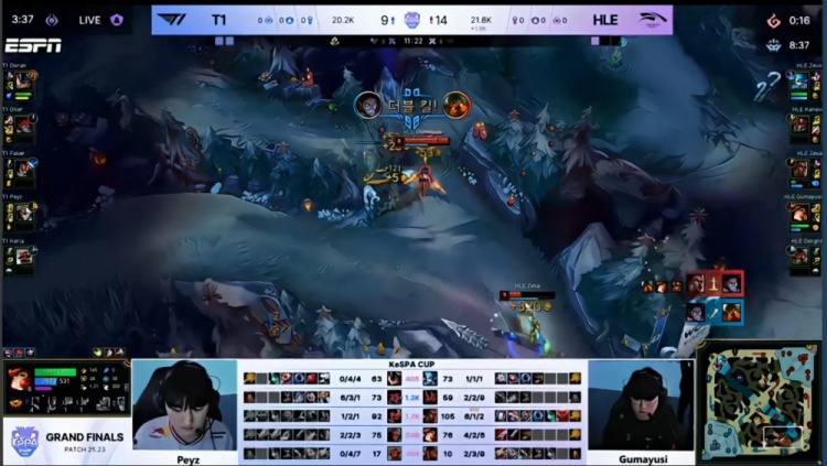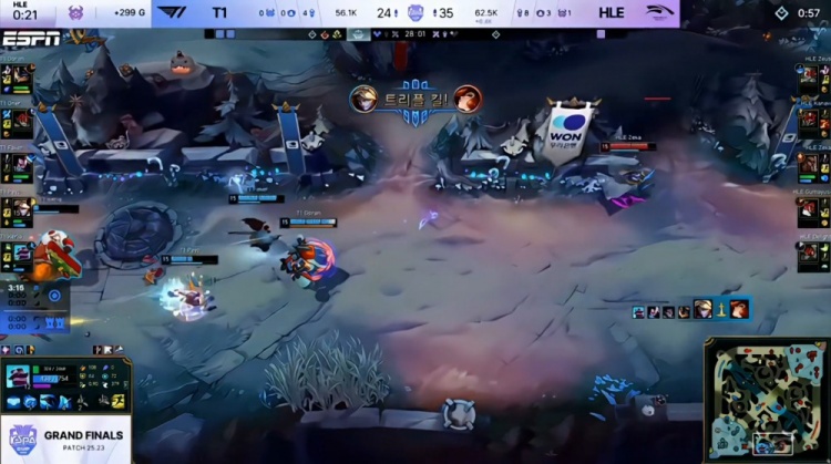 中期先锋团大乱斗Zeka梅尔三杀,但T1听牌电龙魂,Zeka梅尔大人头送给多兰兰博,紧接着多兰就TP下路遭单杀将人头送给宙斯格温。随后HLE下路推进,Oner塞拉斯大人头送给Zeka,小吕布伪四杀阻止T1一时拿到电龙魂,但HLE下路冲上高地送Peyz三杀,T1依旧拿到电龙魂。
