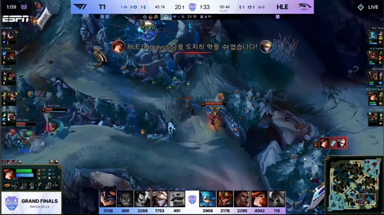 第四局前期多兰兰博遭小吕布女枪单杀,HLE野区大乱斗更胜一筹,HLE四人下路越掉Pezy后,Oner塞拉斯来下拿到双杀,Faker亚索虚线不开大,HLE打出1换3,经济领先2k。