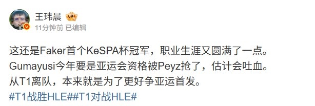 直播吧12月14日讯 KeSpa杯T1战胜HLE夺冠,媒体人王玮晨赛后发文: