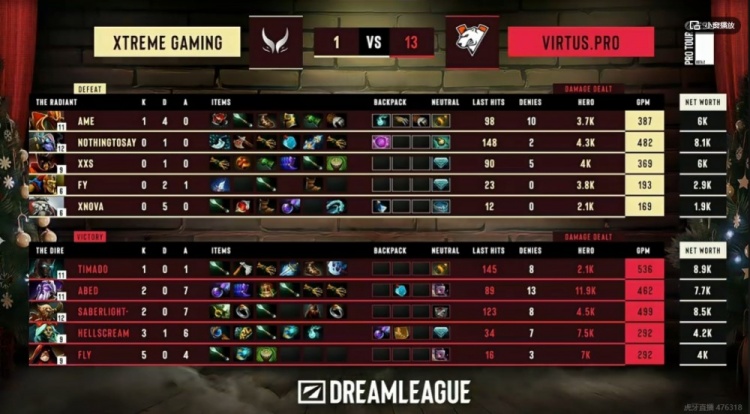 天辉XG:xNova巨牙海民、Ame龙骑士、Fy蝙蝠骑士、NothingToSay修补匠、Xxs末日使者