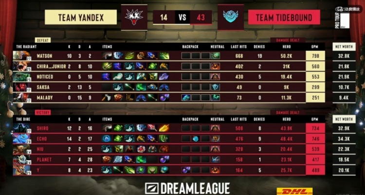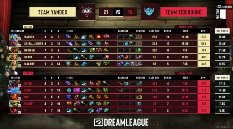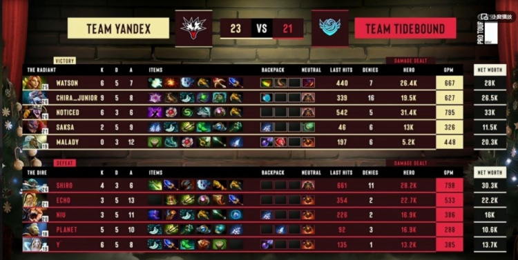 对线期Yandex线优,但是7分钟下路团Echozz帕克大配合niu马尔斯矛,TBD一波击杀对手双大哥!16分钟Yandex中路打出漂亮combo秒掉Echozz帕克,回头拿下一代肉山+5K经济优势!但是随即TBD一波漂亮团战1换3打回局势!22分钟兽王吼配合梅肯笛子强杀shiro拍拍,Yandex一波1换4之后先破一路高地!