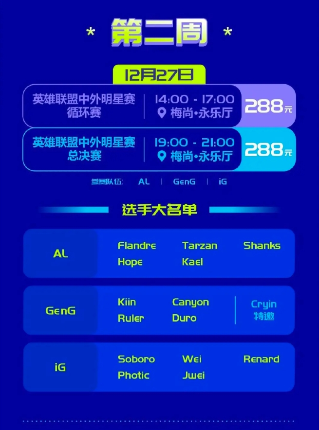 直播吧12月15日讯 濮院电竞节英雄联盟中外明星赛,GEN将特邀Cryin担任中单参与比赛,另外两支参赛队伍为AL、iG。