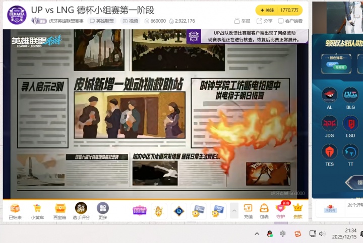直播吧12月15日讯 德玛西亚杯首日比赛,多队出现网络波动,首场LGD第二局多次掉线调整无果,无法继续暂停故而弃权;第二场也进入短暂的暂停;第三场LNG对阵UP,再度出现网络波动,已经暂停许久。